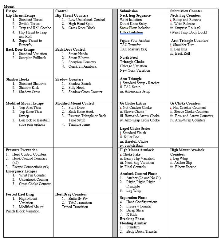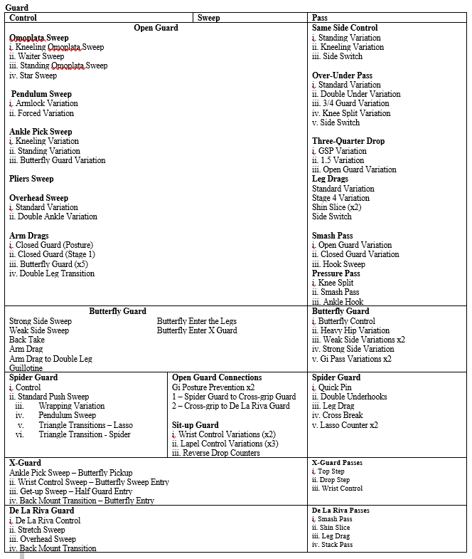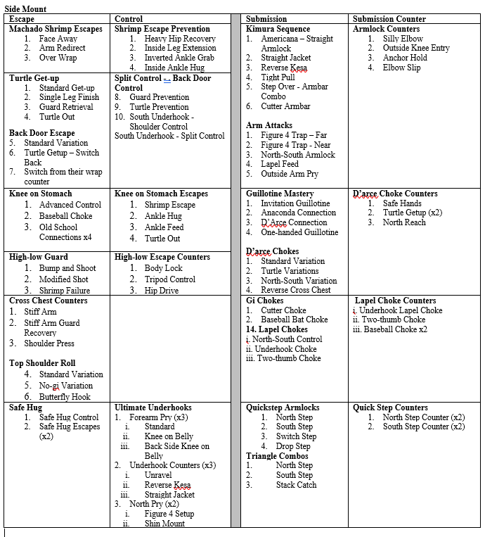 14. 3 control variations from all variations of control: Side Mount, Knee, Full, and Back as well as be able to move between them all. Transition Focused